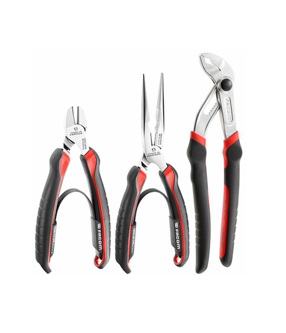 Facom CPE.A3 3-piece pliers set. Set with locking multi-grip pliers, diagonal cutting pliers and half-round nose pliers.