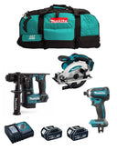 The Makita kit contains DHR171 hammer + DTD152 impact driver + DSS610 circular saw + 2bat 5Ah BL1850B + DC18RC charger + LXT600 wheeled bag