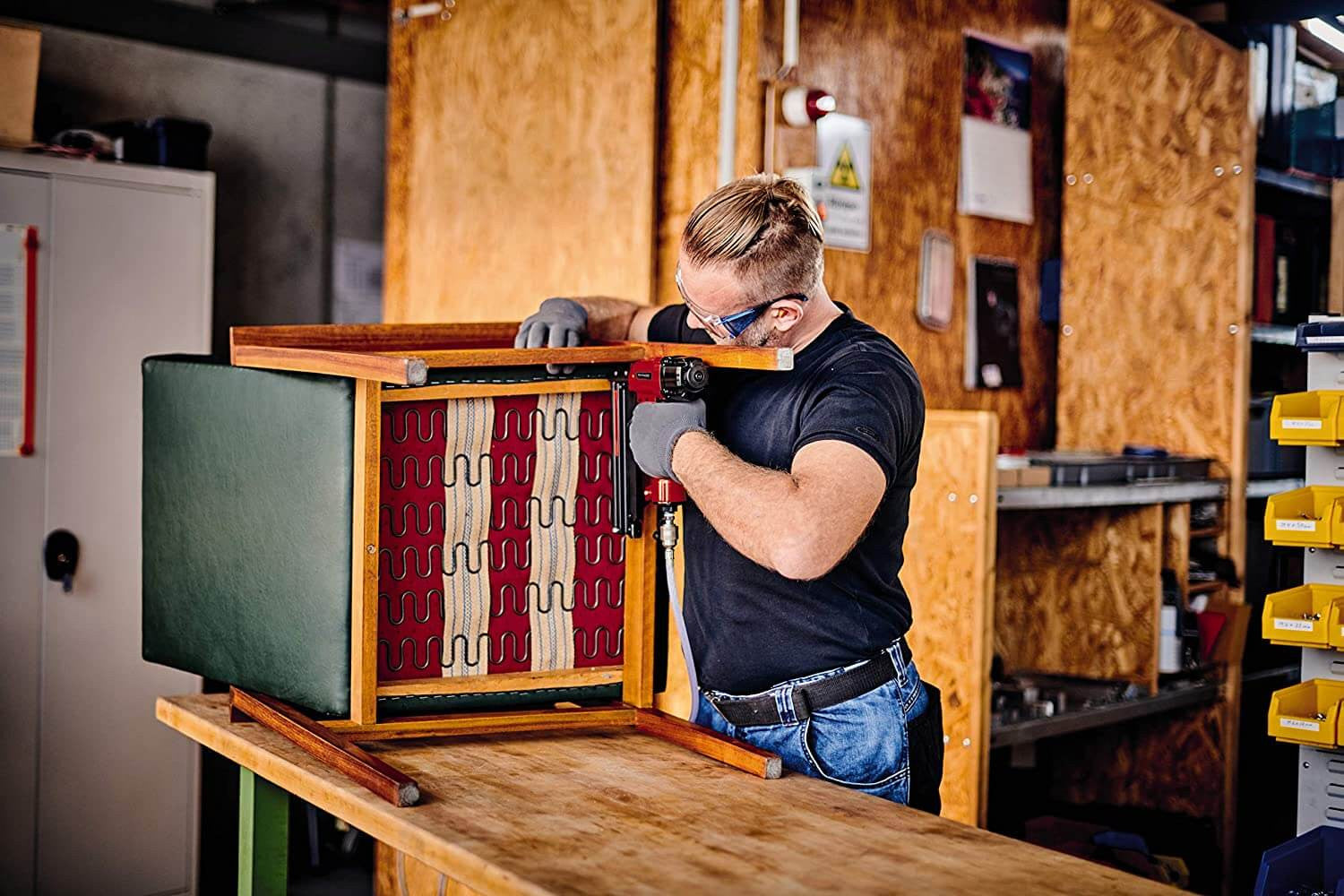 • Se entrega con grapas de una longitud de 16/25/40 mm, respectivamente 1.000 clavos con longitud de 25/40 mm, 1 botella de aceite (sin aceite), 1 boquilla y 2 llaves allen. Se entrega en un práctico maletín de transporte y almacenamiento