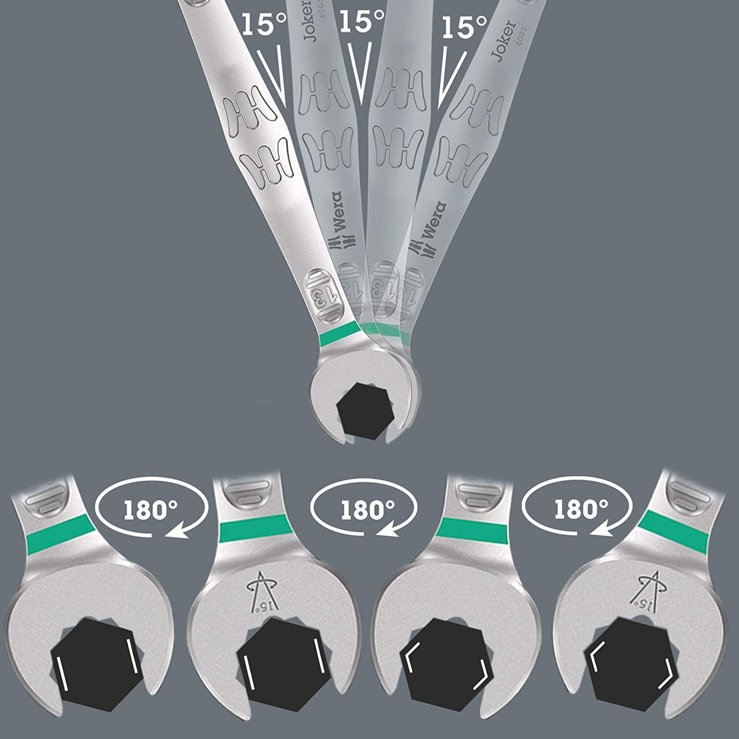 • Con un giro repetido de 180° de la llave alrededor del eje longitudinal durante el apriete, hay cuatro posibilidades de sujeción y las tuercas o cabezas de los tornillos se pueden "agarrar" cada 15°.