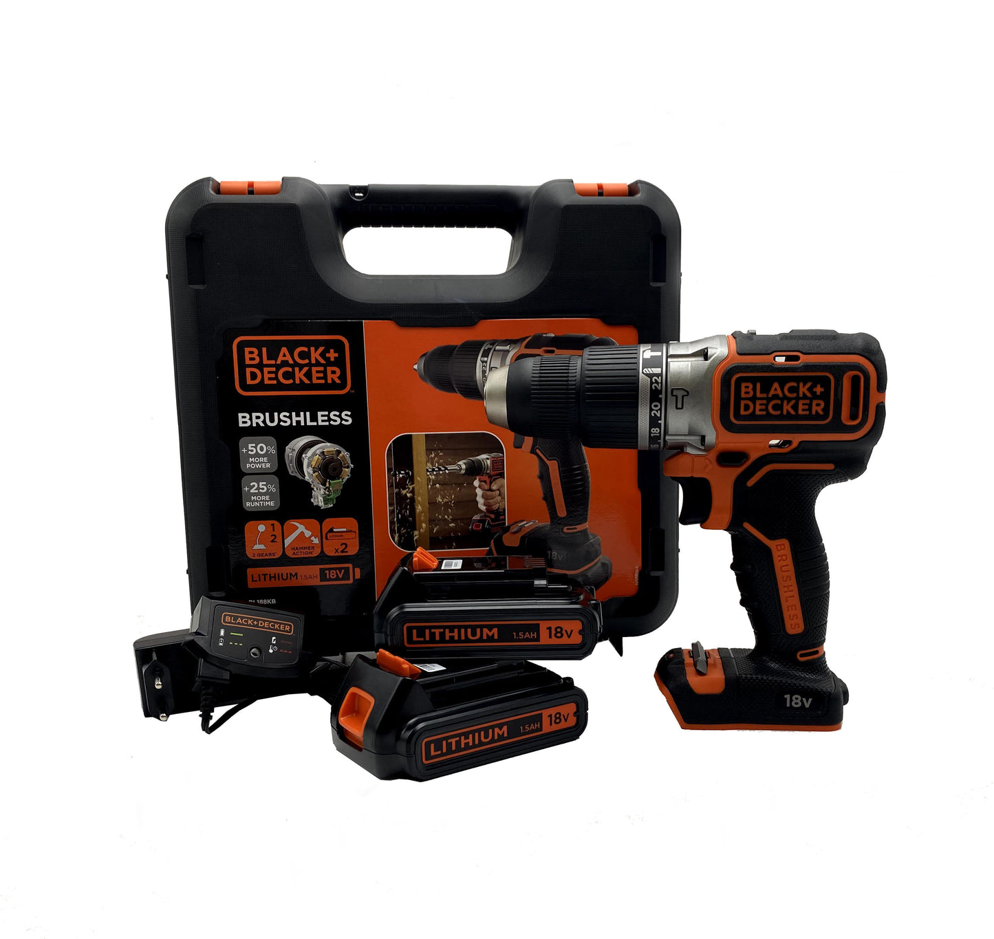 Taladro percutor Black+Decker BL188KB Sin escobillas - 18 V 2 bat. 1,5 Ah y maletín