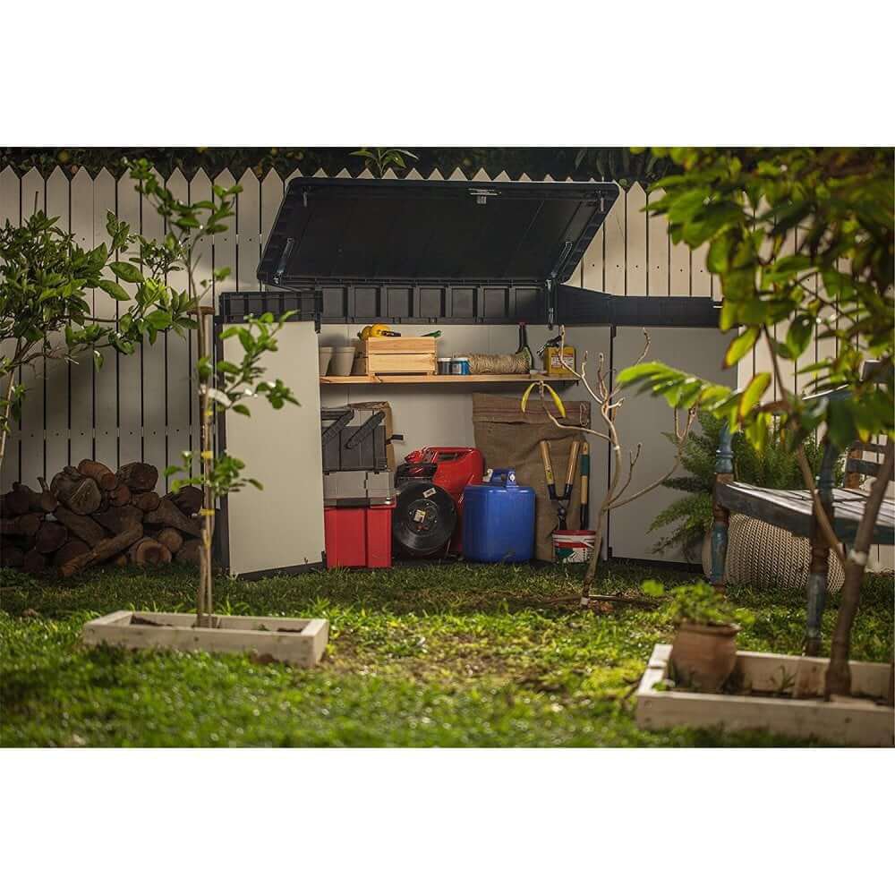 Capacité de stockage : 2 poubelles de 240 L ou 2 vélos, outils de jardin et tondeuses à gazon