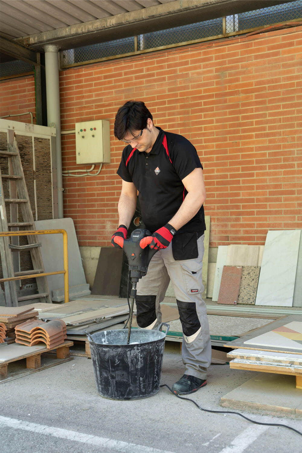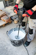 Avec la tige à 3 hélices de 140 mm de diamètre que le RUBIMIX-9 POWER MAX intègre en standard, il est possible de réaliser des mélanges jusqu'à 40 kg de colle céramique ou de tout autre matériau à base de ciment. Mais, grâce à ses 2100W, le RUBIMIX-9 POWER MAX peut monter des tiges de mélange jusqu'à 160 mm, ce qui nous permettra de mélanger jusqu'à 60 kg de matériau.
