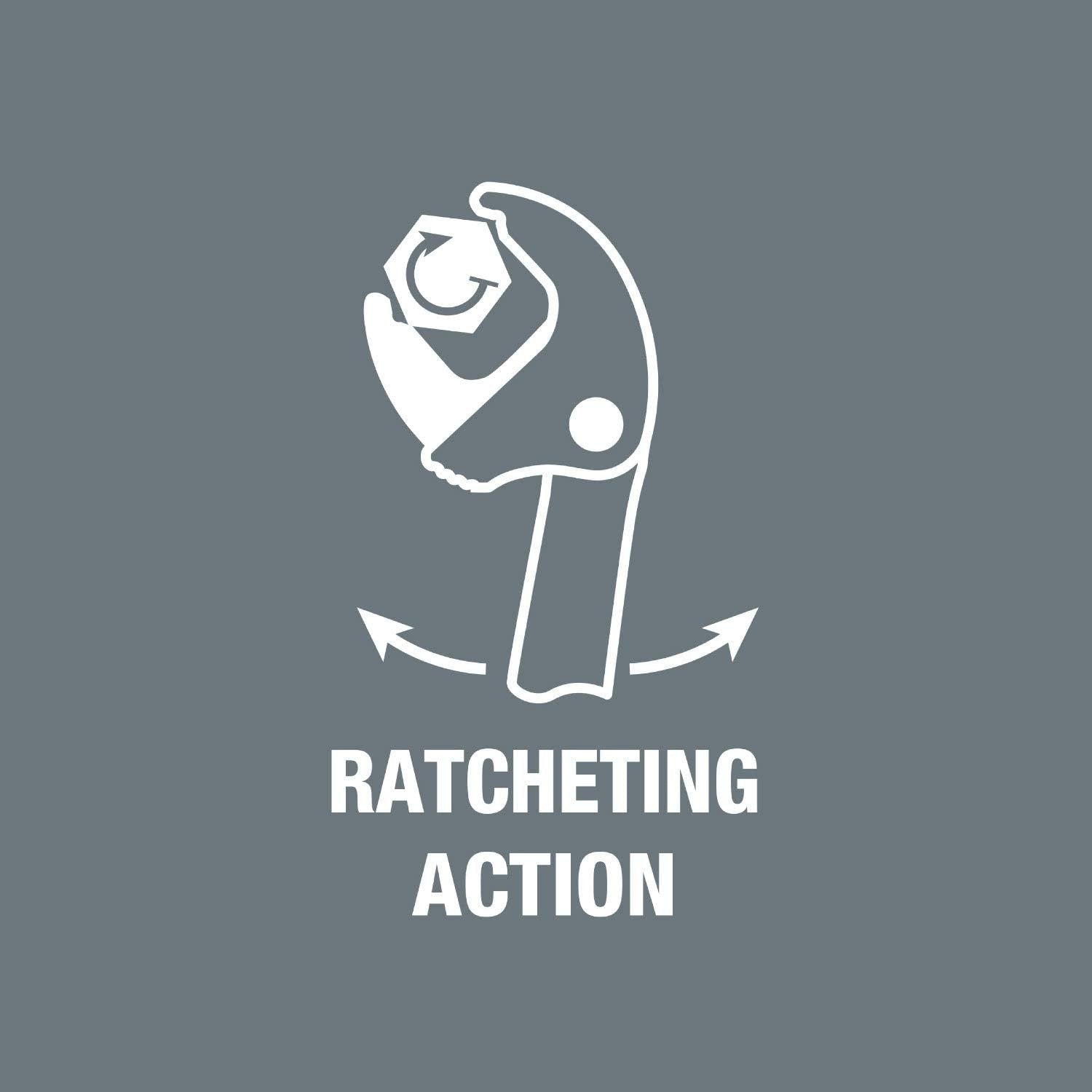 Le mécanisme à levier intégré maintient la vis ou l'écrou hexagonal en toute sécurité entre les mâchoires, réduisant ainsi considérablement le risque de glissement ou de dommages. La fonction cliquet intégrée à cet outil permet un travail rapide et ininterrompu sans avoir à repositionner constamment la clé.