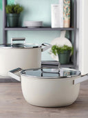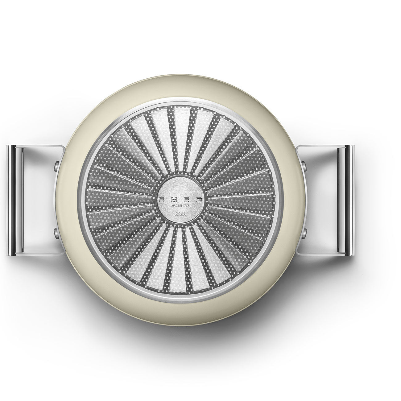 Conjunto de 5 piezas de menaje Smeg ideal para completar la cocina, este conjunto está formado por: Olla de 26 cm con una capacidad de 7,7 l, olla de 24 cm con una capacidad de 4,6 l, cazo de 20 cm con una capacidad de 2,7 l, satén de 28 cm y 24 cm con un acabado crema mate antiadherente están diseñados para todo tipo de preparaciones y recetas, son perfecta en función del estilo y calidad de comida que se está cocinando.