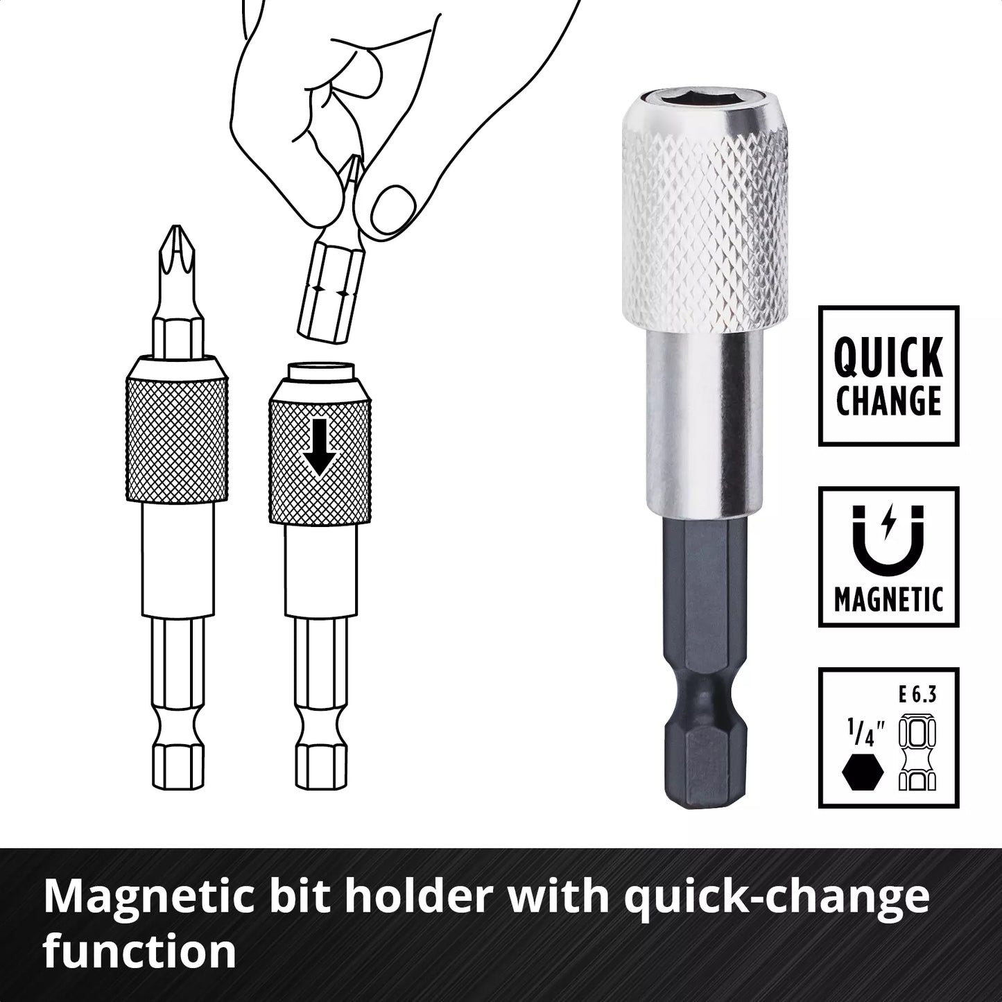 - 1 snelwissel bithouder van 60 mm, gemaakt van koolstofstaal met E 6.3-schacht en een krachtige magneet voor stevige grip en snelle bitwissels.