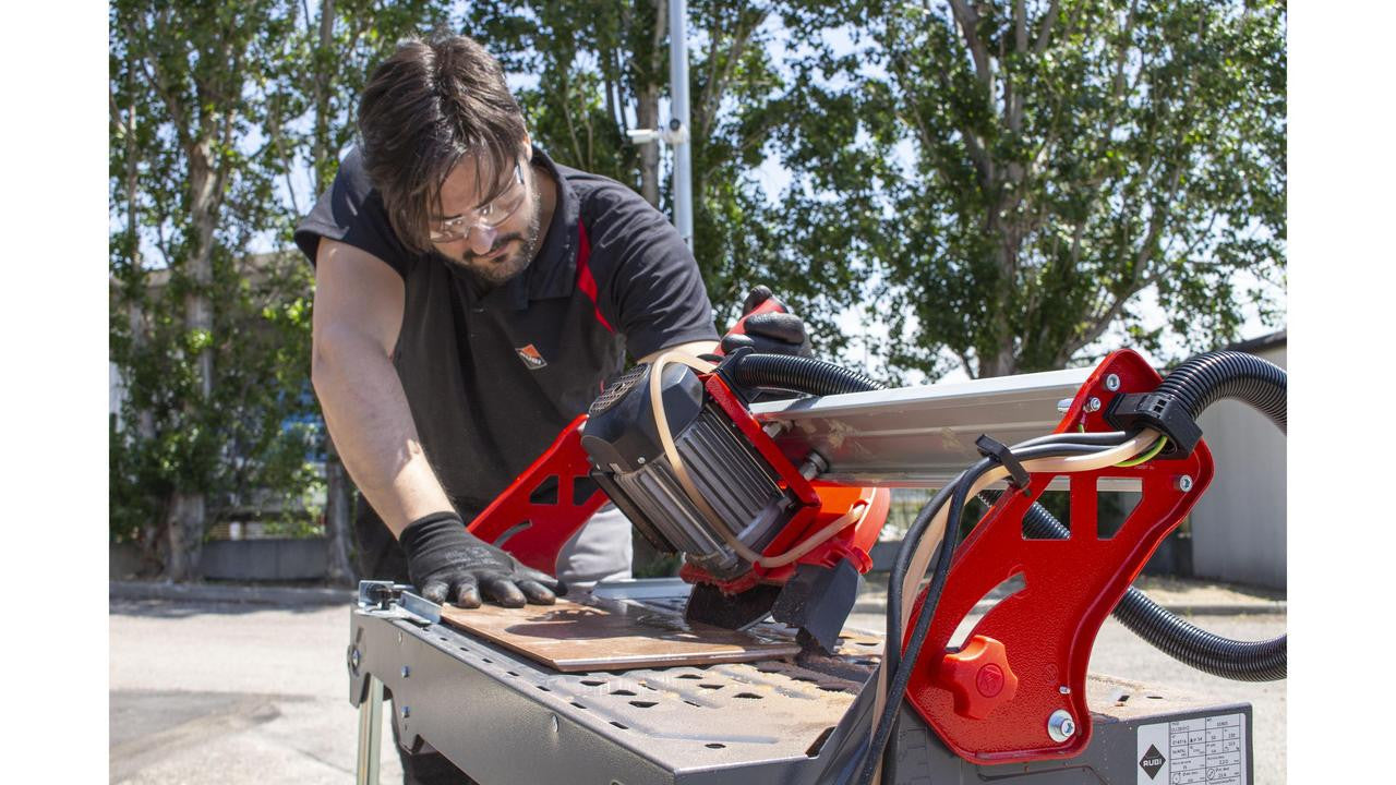 De kop van de elektrische tegelsnijder DU-200 EVO van RUBI glijdt op 4 lagers, kan worden gekanteld tot 45º voor versteksnedes en is uitgerust met een handgreep van bi-materiaal om de gebruiker meer ergonomie en comfort te bieden