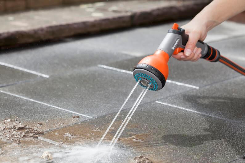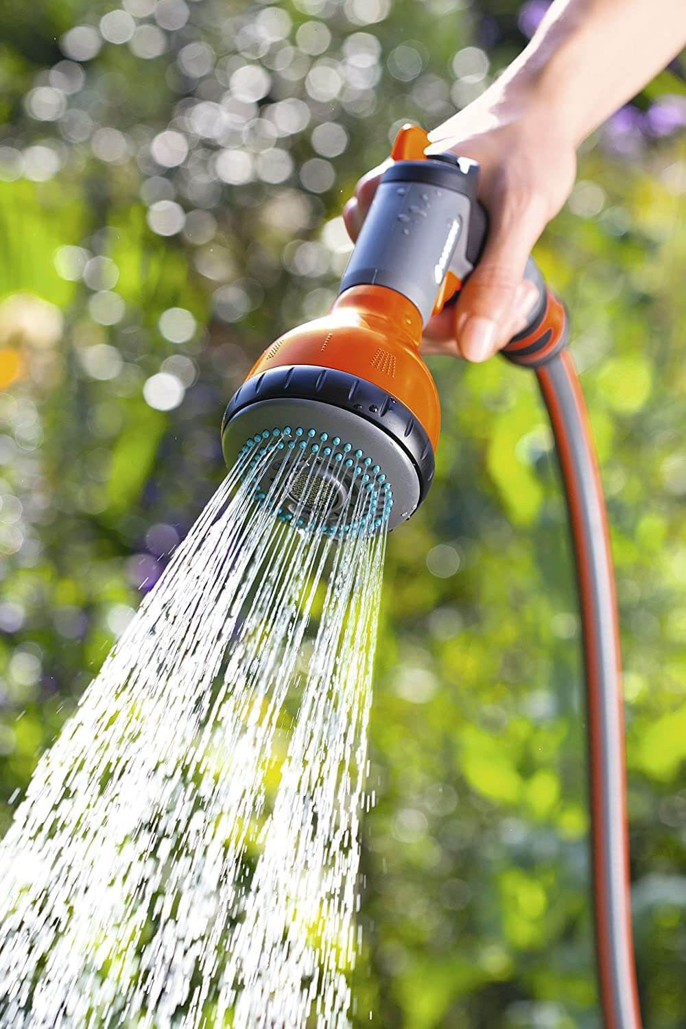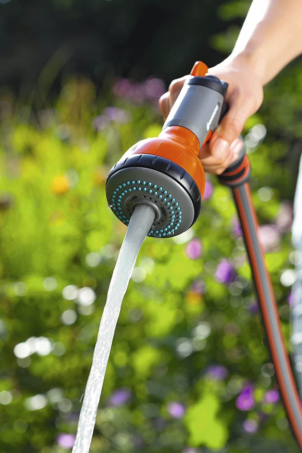 - 3 straalsoorten: 9 harde stralen voor hoge reinigingskracht // Zachte bruisstraal voor het besproeien van potplanten // Zachte straal voor het besproeien van afzonderlijke zones in de tuin