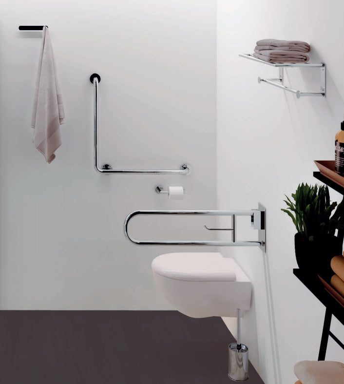 Driehoekige handgreep ontworpen om te dienen als aanvulling op de douche of het bad om mensen met beperkte mobiliteit te helpen stabiliseren, bukken of opstaan, met twee goed onderscheiden gebieden met een antisliptextuur die de grip vergemakkelijkt.