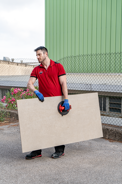 Batterij-zuignap ontworpen voor het hanteren van keramische tegels. 3,7V / 2 Ah batterij geïntegreerd in de zuignap en oplaadbaar via USB-C-kabel.