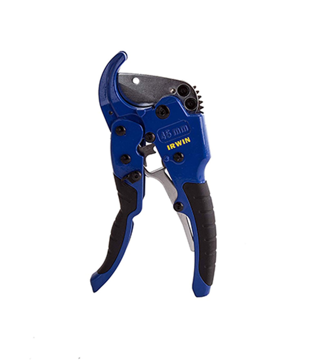 45mm PVC pijpsnijder referentie 10507485 van Irwin, heefteen uniek "V" vormig blad dat uit het midden kan bewegen waardoor de pijp minder vervormt