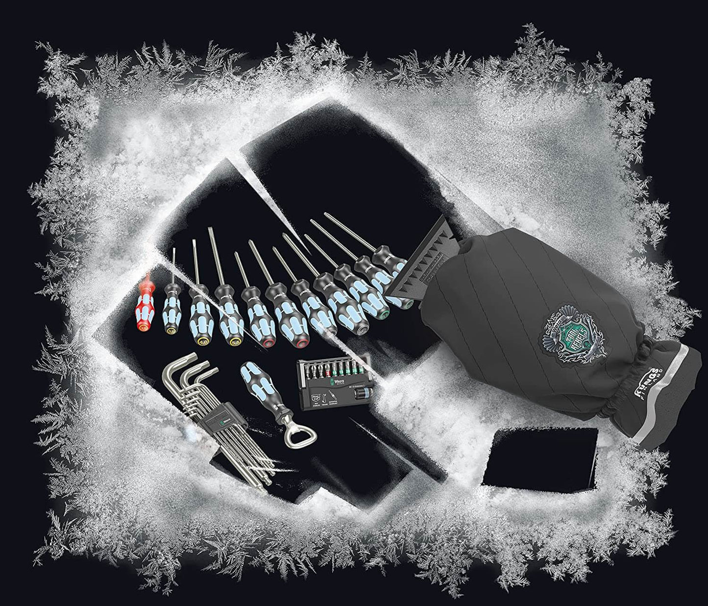 - Torx en sleuf, Phillips en Pozidriv schroevendraaier met laserpunt voor betere grip op de schroefkop), hoeksleutel (Hex Plus vermindert het ronddraaien van inbusschroeven), bitjes, bithouder en Wera Kult flesopener