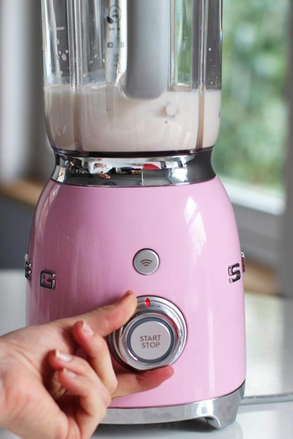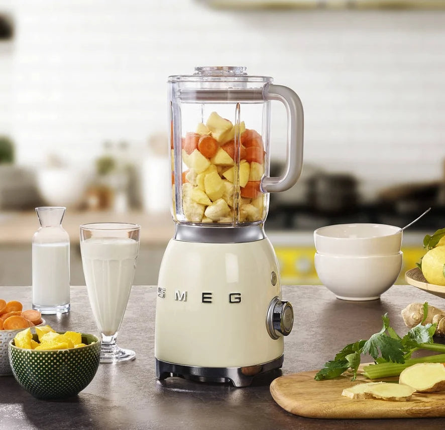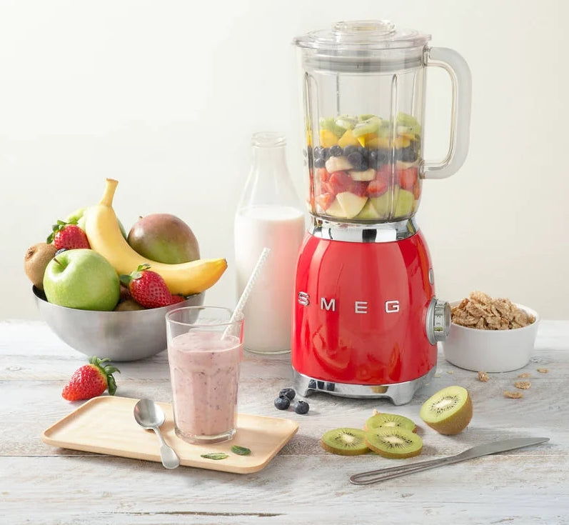 Smeg glazen blender. Motorhuis en voet van gegoten aluminium voor betere bescherming. Blender in jaren 50. Tritan kan.