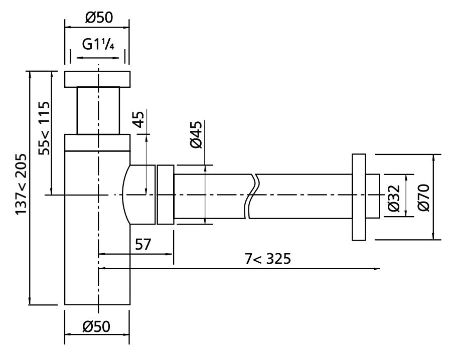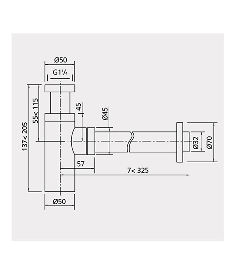 Chromen sifon voor Wirquin wastafel. Verchroomde messing verstelbare sifon. Inlaat 1 1/4. Hoogte van 137 tot 205 mm. Buis met een diameter van 32 mm en een lengte van 325 mm